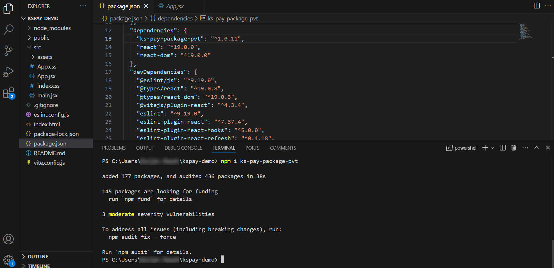 KS-PAY relies on NPM to install dependencies in React.