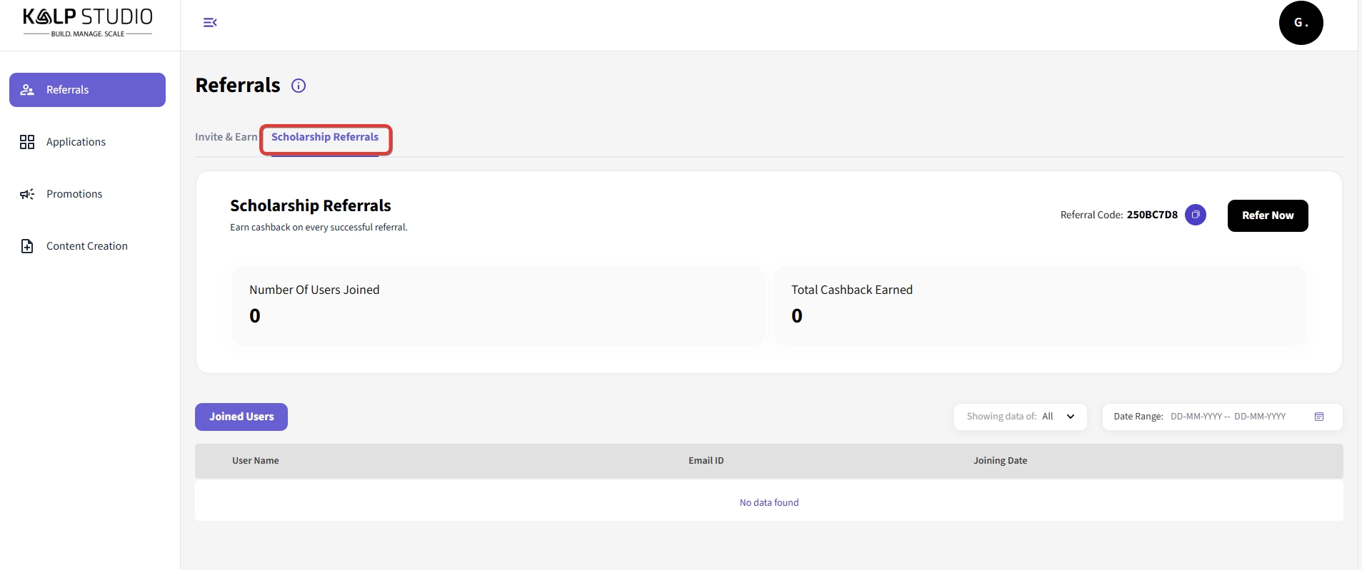 Total Cashback Earned: This indicates the Total Cashback you have earned when the user joins the Scholarship Program using your code.