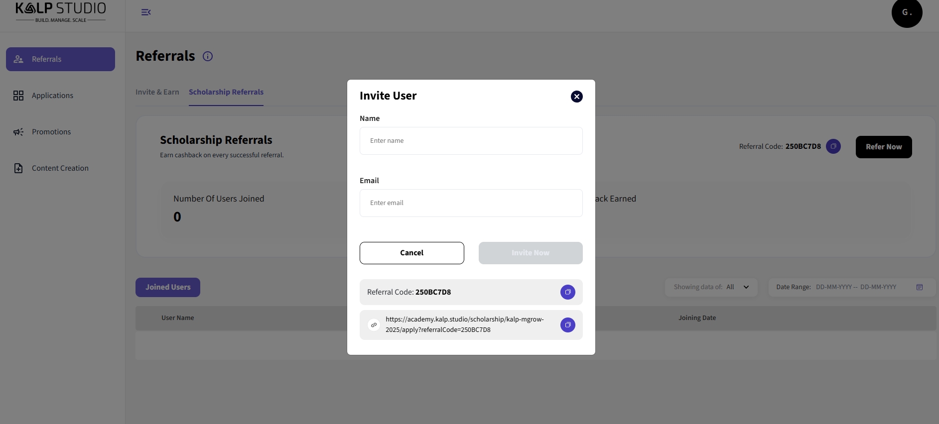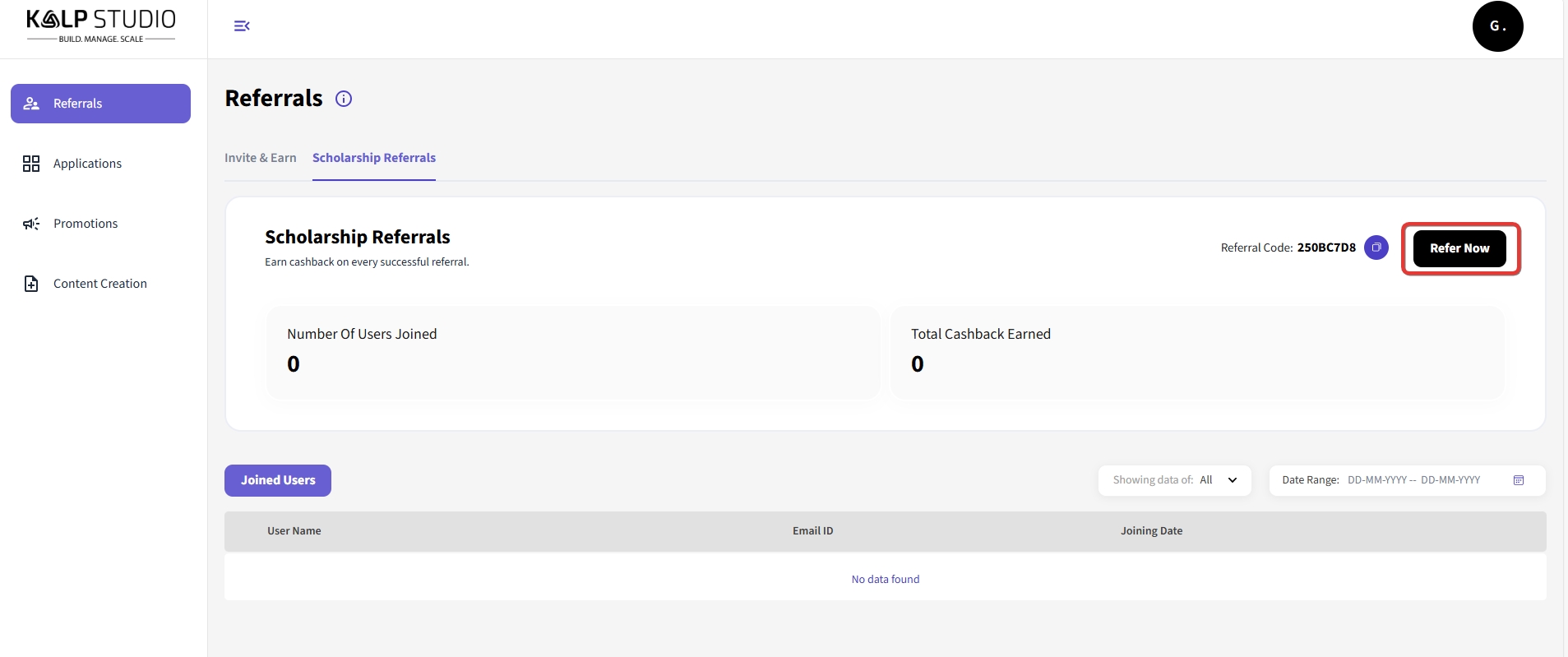 Number Of Users Joined: This shows the number of users who have successfully joined Kalp Studio using your unique referral link or code.