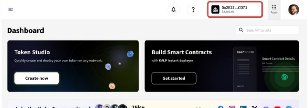 After confirming the connection, you’ll see your wallet connected on the Kalp Token Studio interface. Now, you are ready to use the Token studio to create and deploy your tokens.