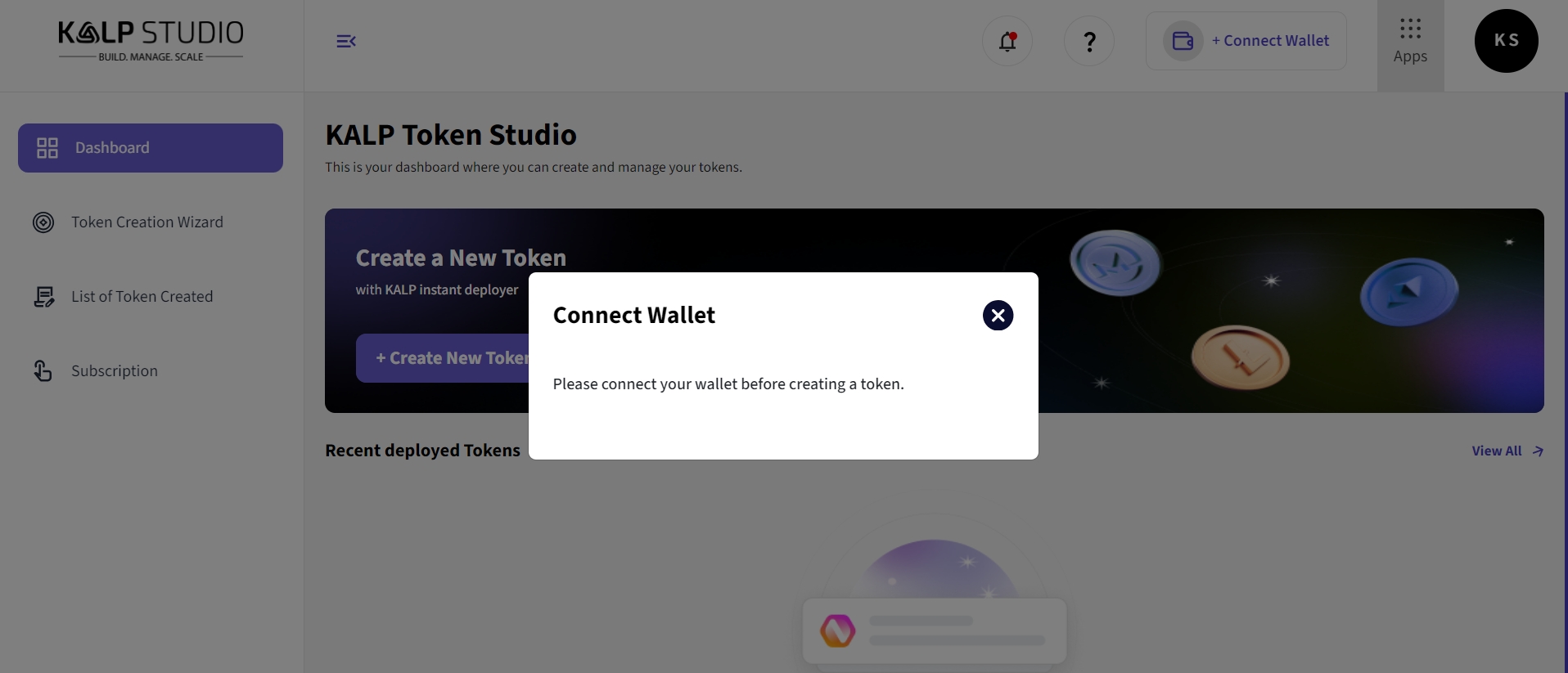 Connecting your wallet is a necessary step to start creating tokens on Kalp Studio’s Token Studio. The wallet connection allows you to securely interact with blockchain features and manage your assets directly. Here’s a detailed guide on how to connect your wallet to begin using the Token studio tool.