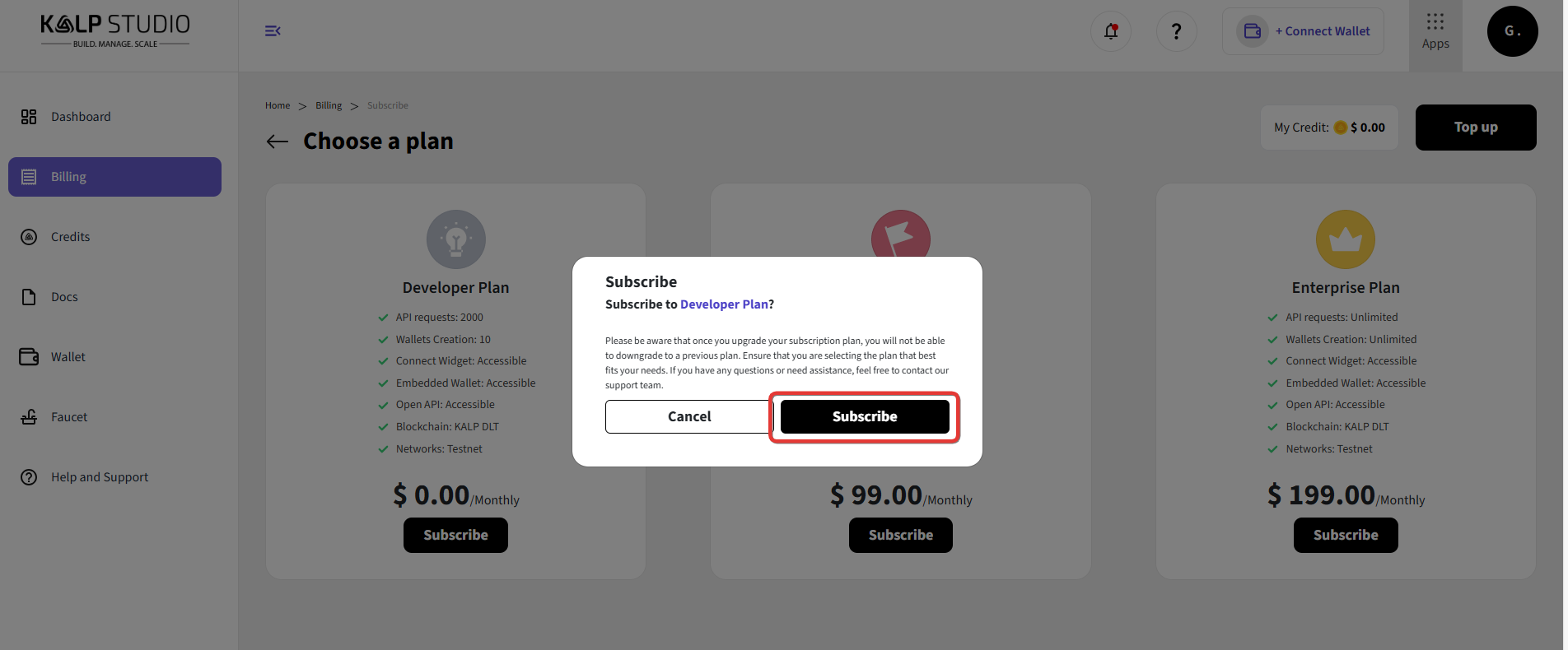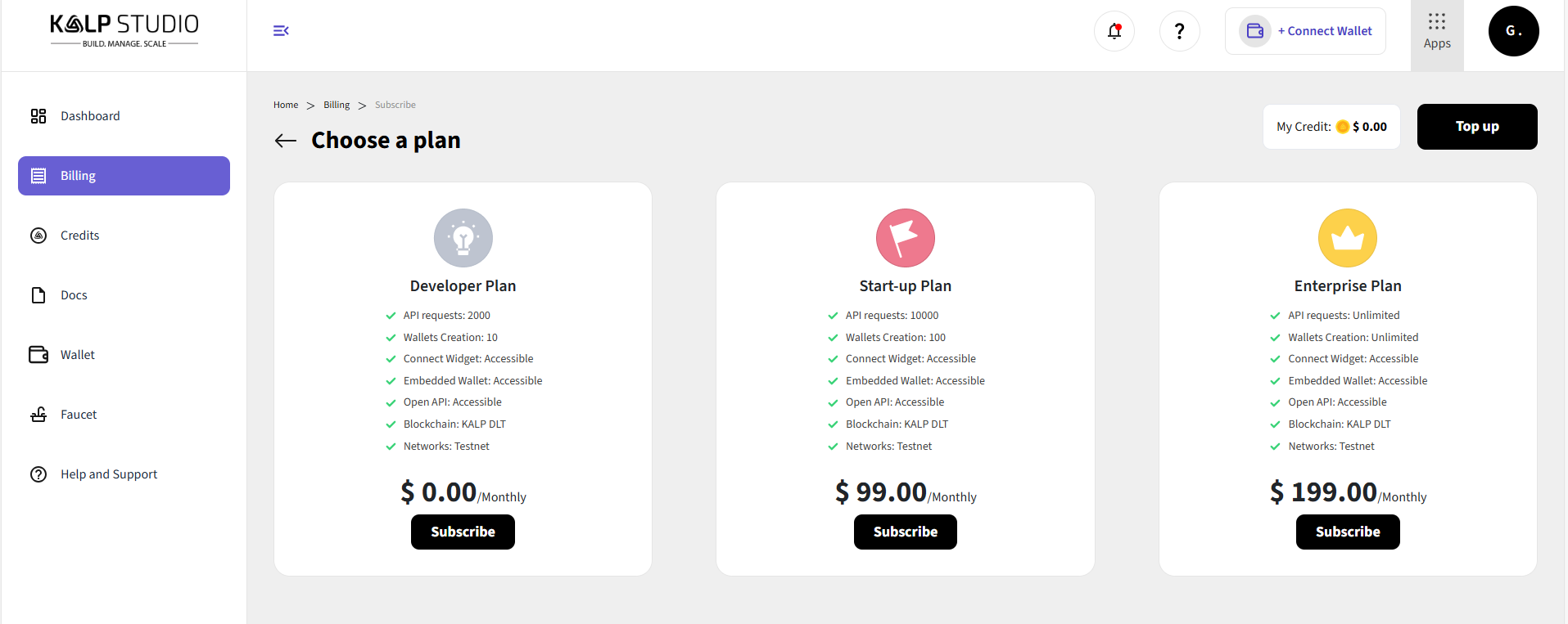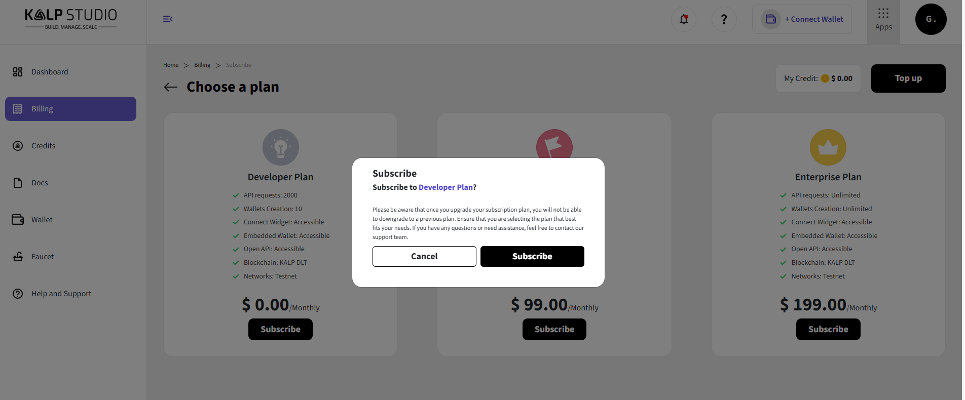 Choose the Plan: For accessing the Kalp Wallet Dashboard you have to select the one of the plans and then subscribe it.
