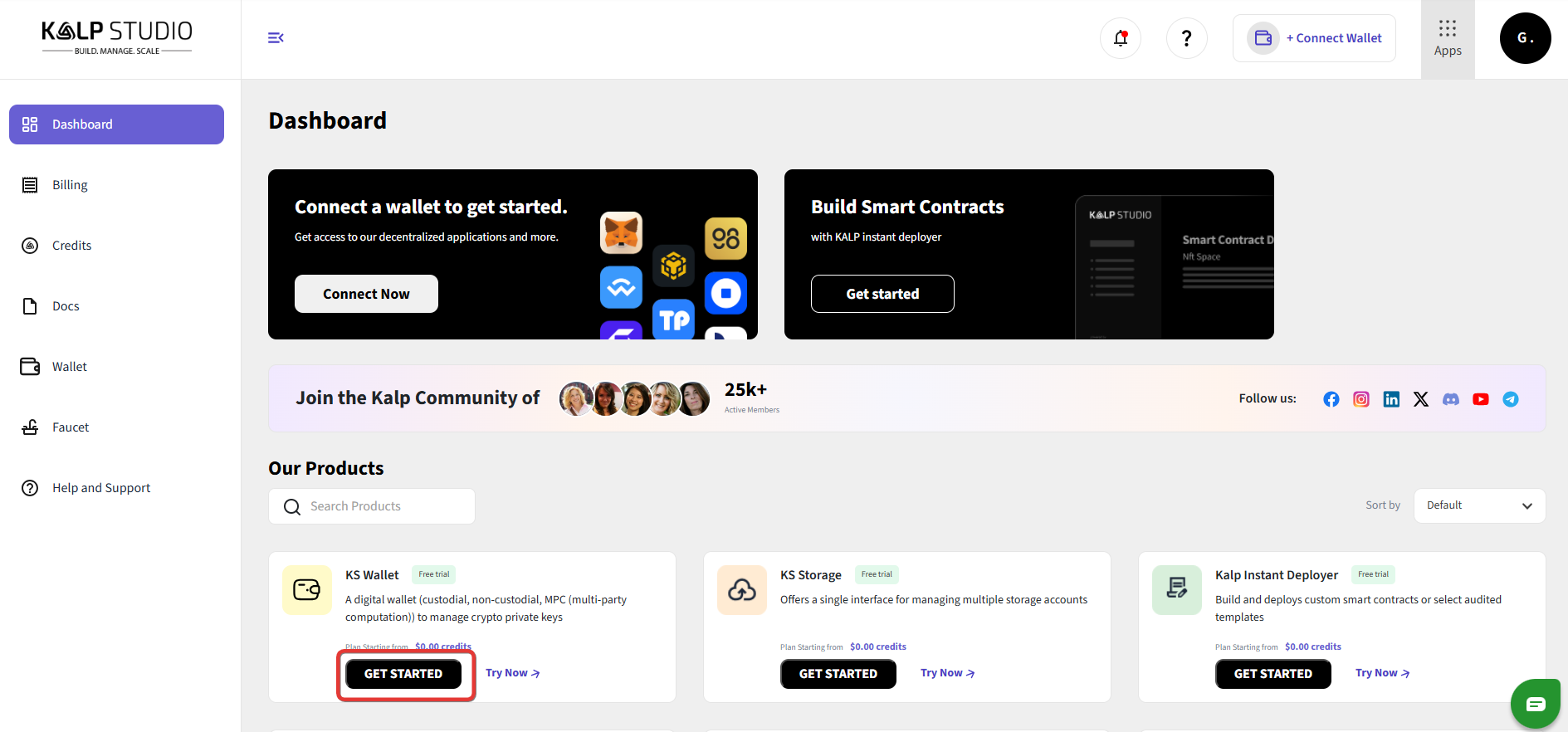 Product Page: After Successfully Sign-In you will find a product page. In this page you will see different applications like SMS, Kalp Instant Deployer, Email, KS Storage, KS Wallet, KS Query, NFT Creator, Token Studio, API Gateway.