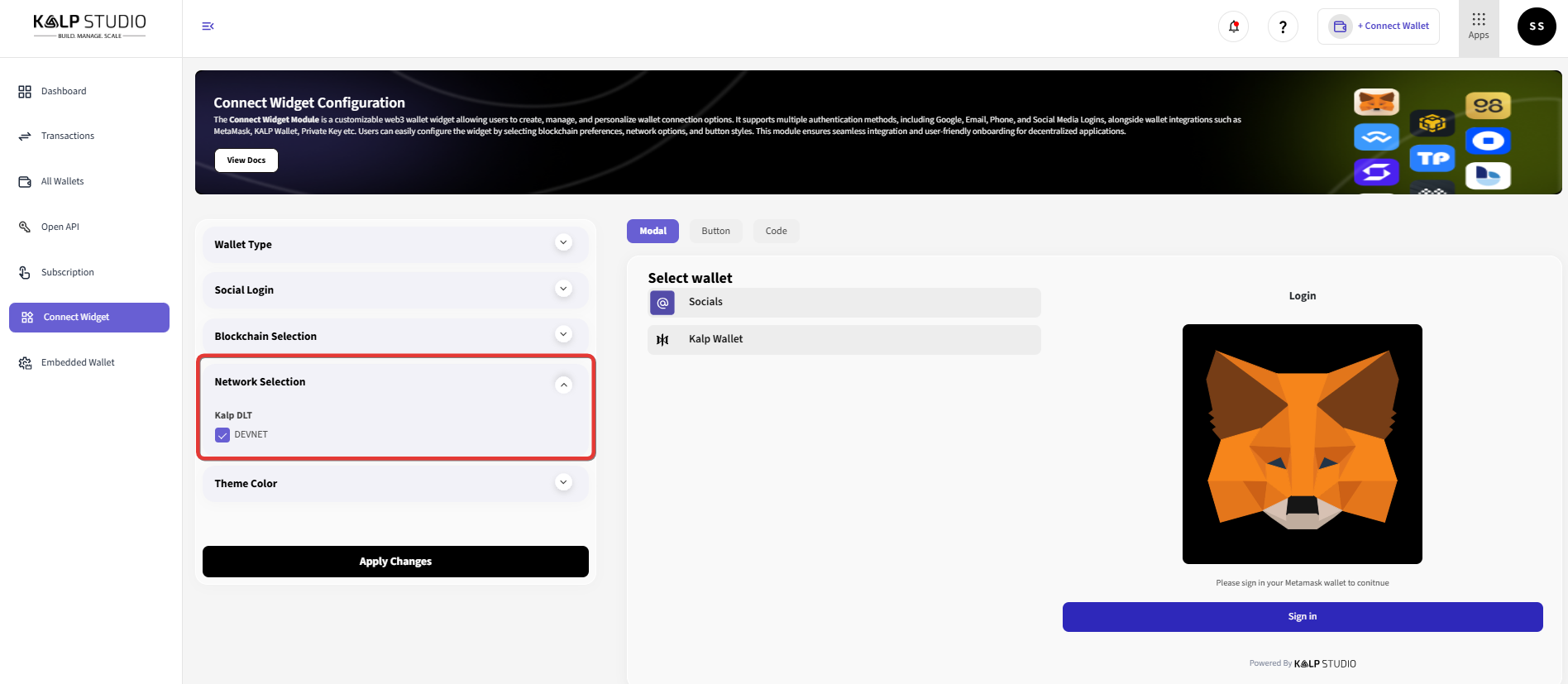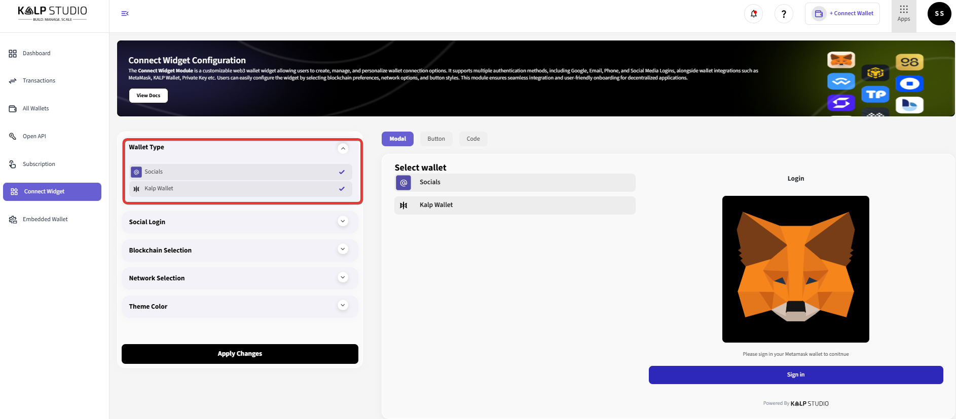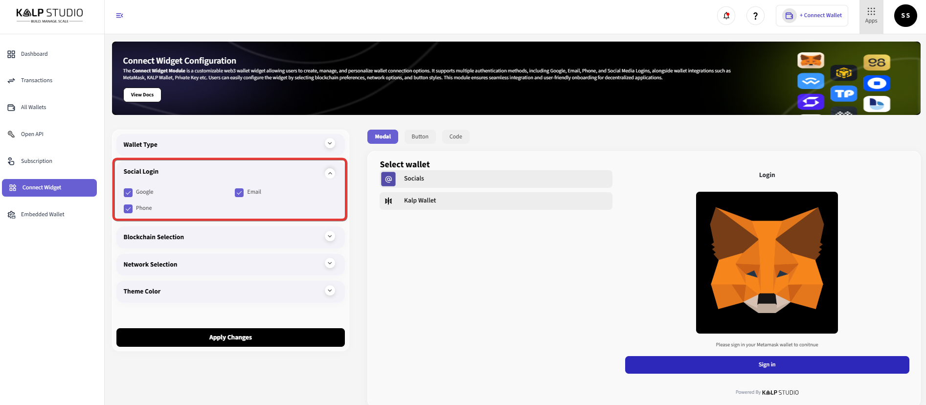 • Choose the desired wallet types you want to support. The screenshots indicate options like "Socials" and "Kalp Wallet." By selecting these, you'll enable users to connect using their preferred type of wallet.