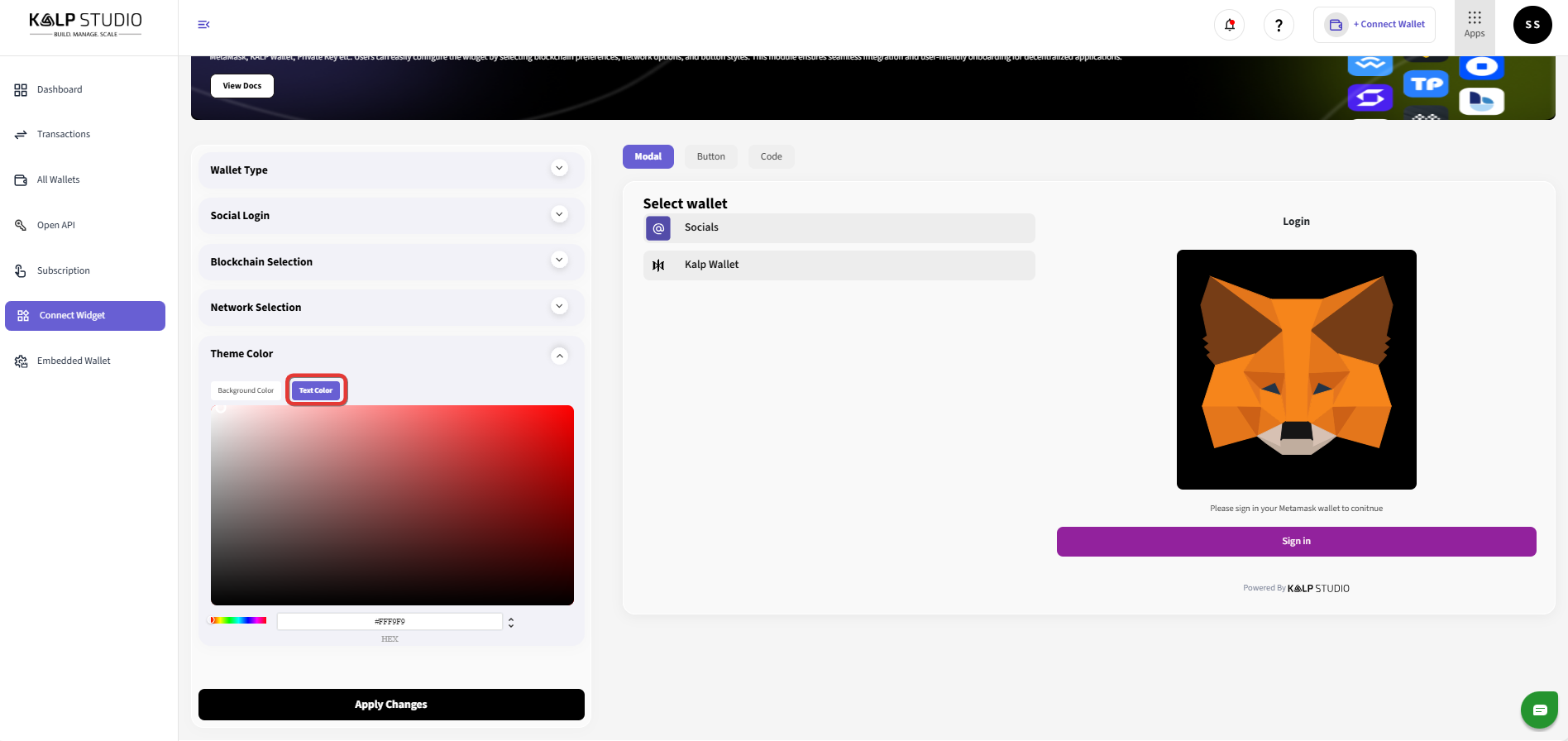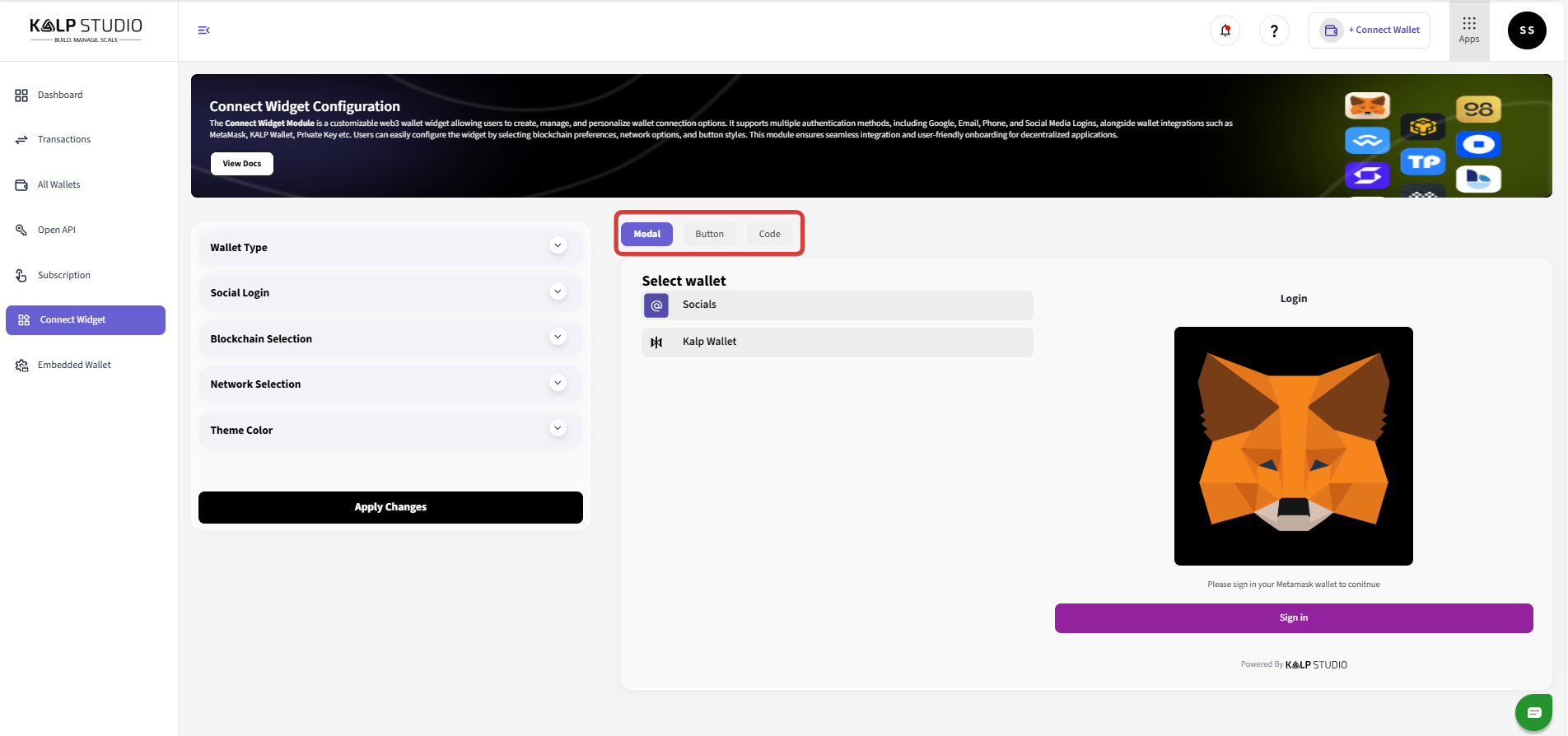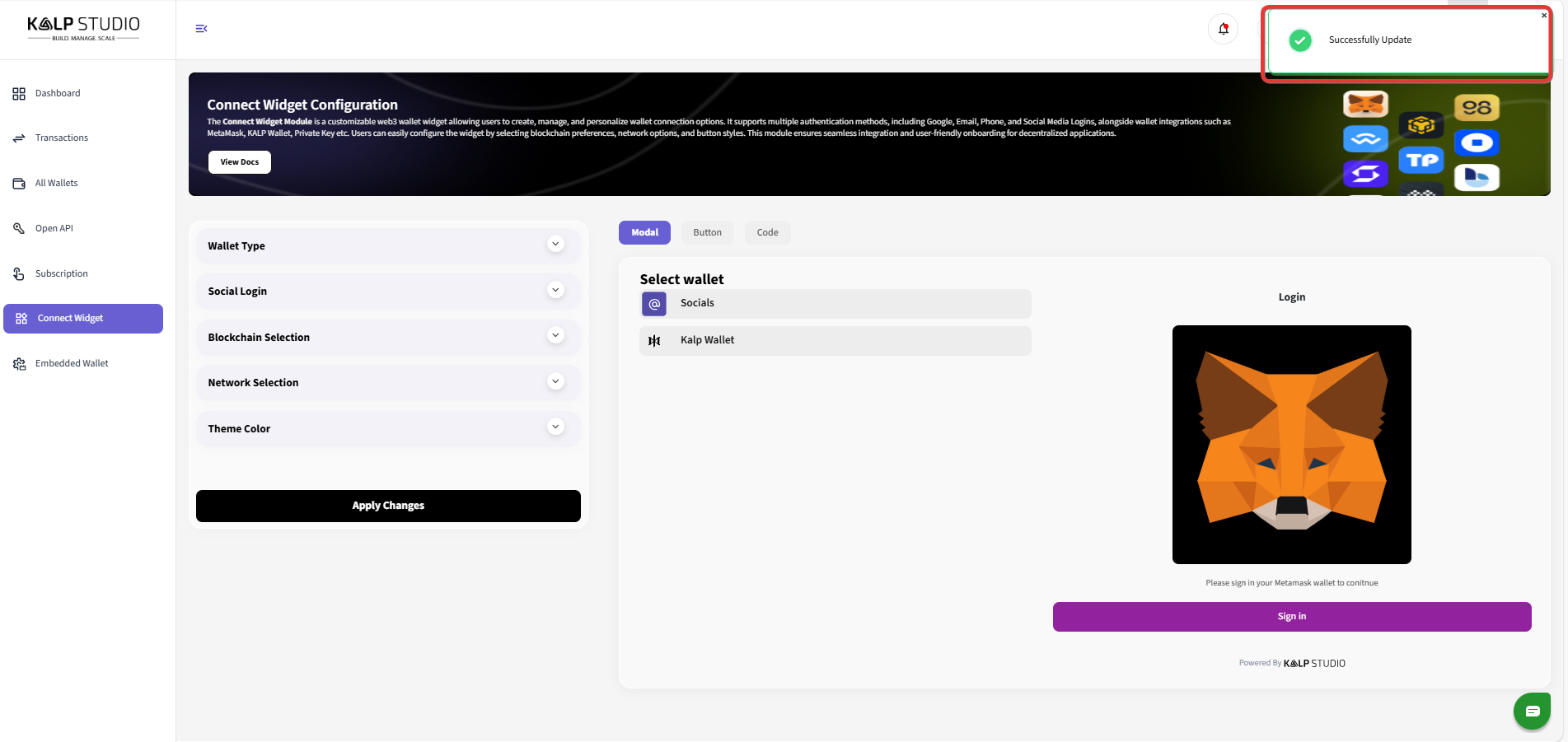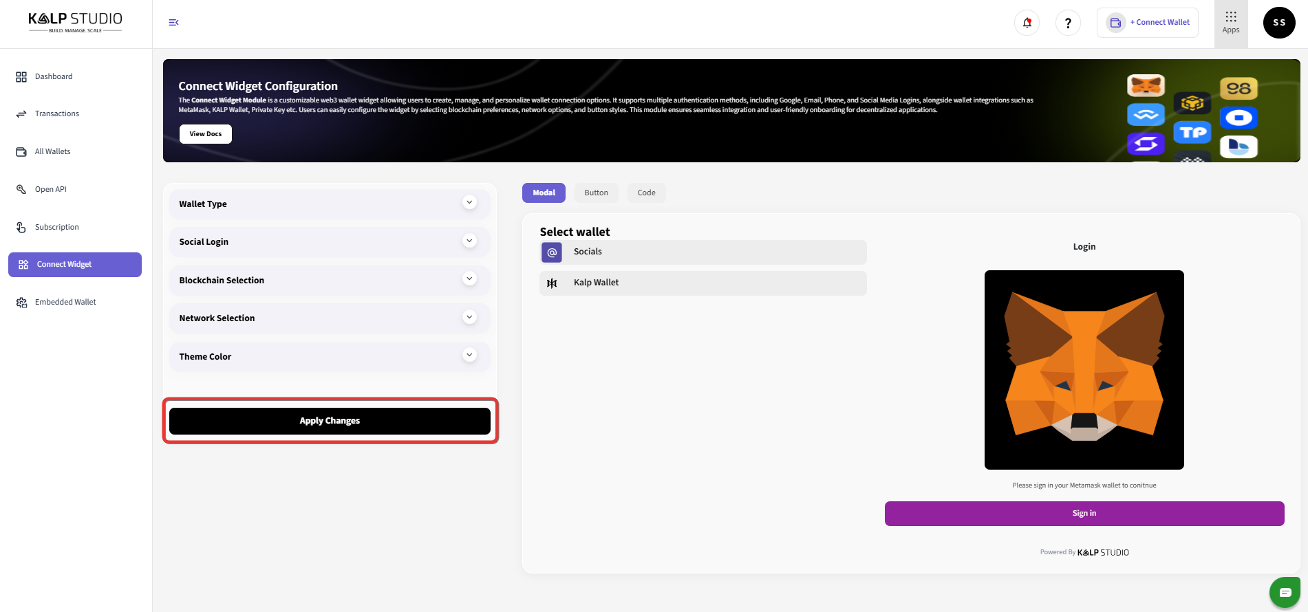 • Choose the desired wallet types you want to support. The screenshots indicate options like "Socials" and "Kalp Wallet." By selecting these, you'll enable users to connect using their preferred type of wallet.