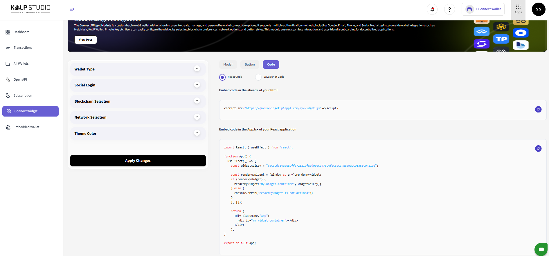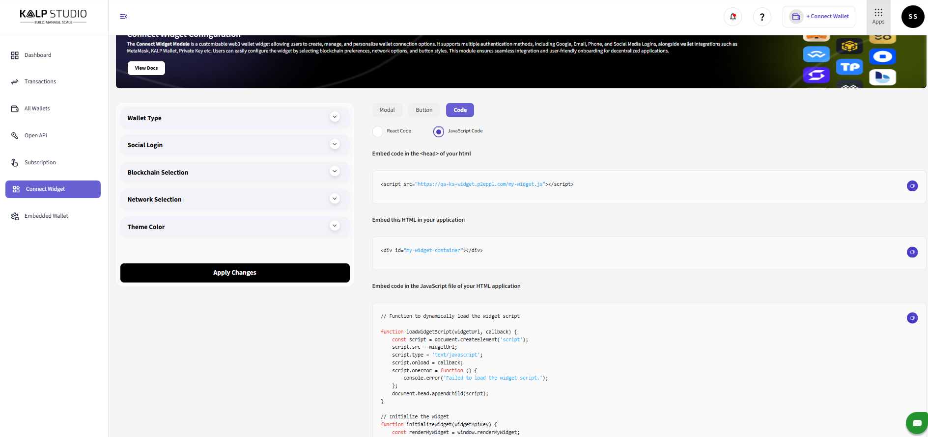 KS Wallet Console allows you to customize further through direct code integration. You can choose between React Code and Javascript Code and embed it on the head of your HTML.
