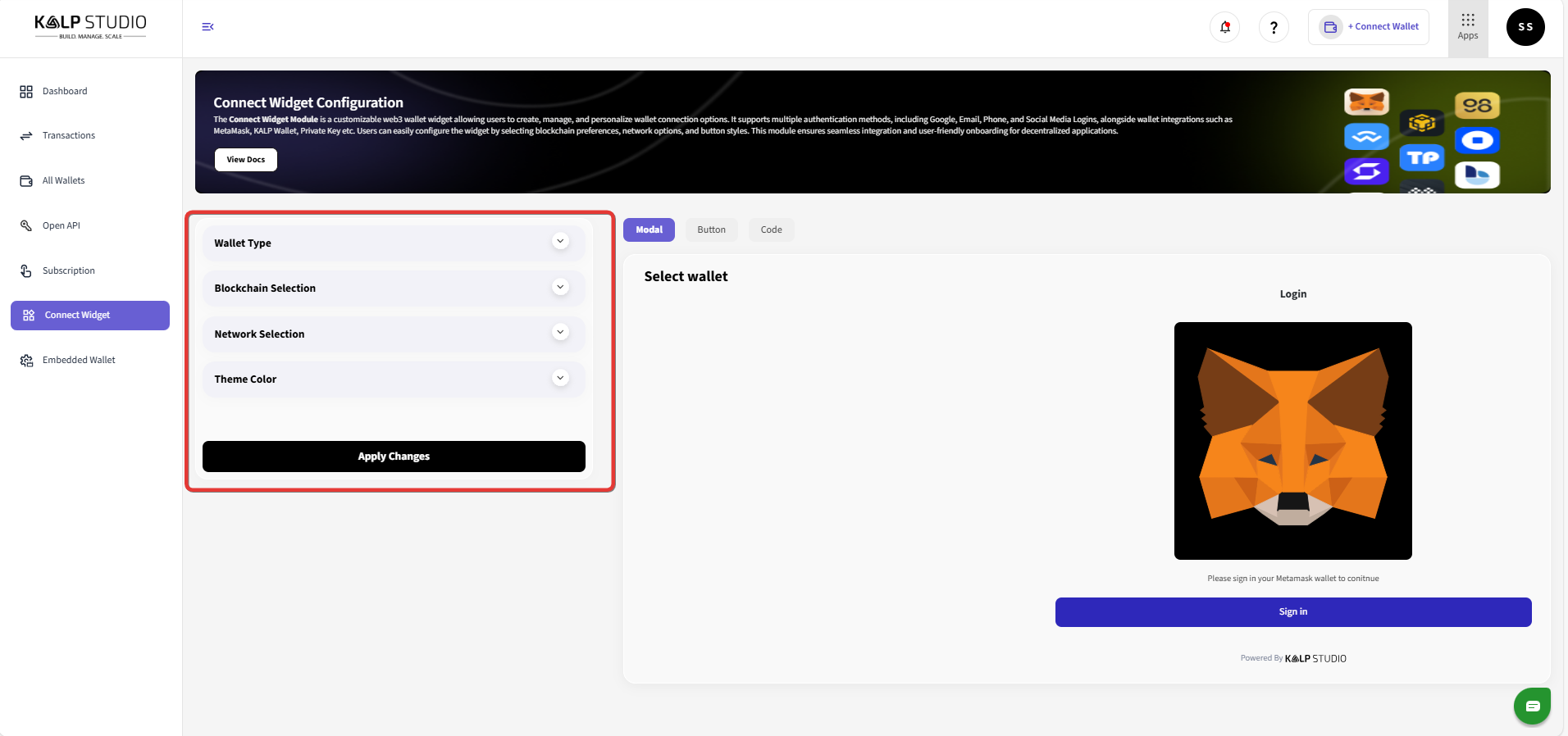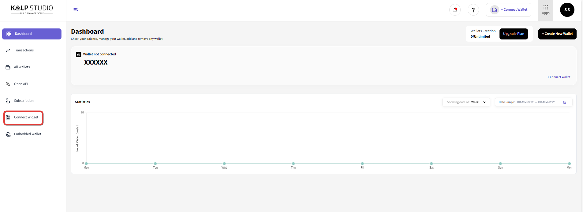 Begin by navigating to the "Connect Widget" option in the sidebar menu of the KS Wallet Console.